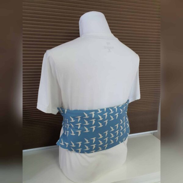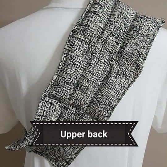 Rectangular shaped pillow. Reaches shoulder to shoulder, down the spine, across the lower back, across the tummy or strap it around your legs or knees.